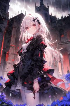 leaning against the ruins, with a floating skeleton in the background.(white stockings),her posture is seductive, her hand is holding her face, and there is a flicker of evil energy runes in the background, blood mist filled, and soft light. Official art, unit 8 k wallpaper, ultra detailed, beautiful and aesthetic, masterpiece, best quality, extremely detailed, dynamic angle, paper skin, radius, iuminosity, cowboyshot, the most beautiful form of Chaos, elegant, a brutalist designed, visual colors, romanticism, by James Jean, roby dwi antono, cross tran, francis bacon, Michael mraz, Adrian ghenie, Petra cortright, Gerhard richter, Takato yamamoto, ashley wood, atmospheric, ((late at night,dark)), light rain,dark, limited palette, contrast,(((Cornflower))), corn
