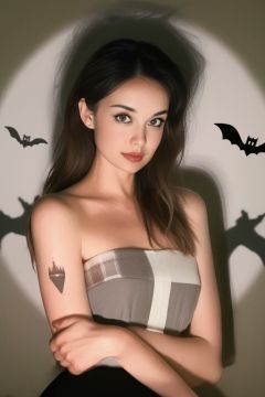<lora:万圣节剪影照-000005:0.9>,(best quality, masterpiece:1.1),silhouette,Audrey Hepburn is wearing a red dress,solo,bat \(animal\),long hair,looking at viewer,black hair,black dress,shadow,black eyes,lips,brown hair,tattoo,dress,halloween,armpits,arms up,upper body,strapless,