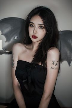 <lora:万圣节剪影照-000005:0.9>,<lora:new_whitegirls:0.6>,(best quality, masterpiece:1.1),1girl,solo,bat \(animal\),long hair,looking at viewer,black hair,black dress,shadow,black eyes,lips,brown hair,tattoo,dress,Demon Shadow on the Wall,halloween,armpits,arms up,upper body,strapless,