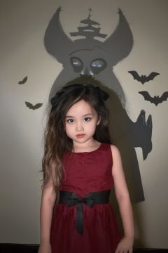 <lora:万圣节剪影照-000005:0.9>,(best quality, masterpiece:1.1),silhouette,a little girl  is wearing a red dress,solo,bat \(animal\),long hair,looking at viewer,black hair,black dress,shadow,black eyes,lips,brown hair,tattoo,dress,halloween,armpits,Behind the wall are silhouettes of demons,bats,castles,and sickle hands,