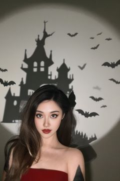 <lora:万圣节剪影照-000005:0.9>,(best quality, masterpiece:1.1),silhouette,a vampire girl with red dress,solo,bat \(animal\),long hair,looking at viewer,black hair,black dress,shadow,black eyes,lips,brown hair,tattoo,dress,halloween,armpits,Behind the wall are silhouettes of demons,bats,castles,and sickle hands,