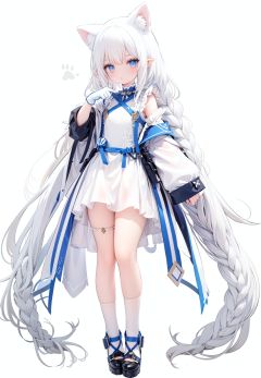 1girl, white_gloves, braid, full_body, gloves, long_hair, official_alternate_costume, pointy_ears, simple_background, solo, standing, very_long_hair, white_background, white hair, blue eyes, paw claw pose, open_mouth