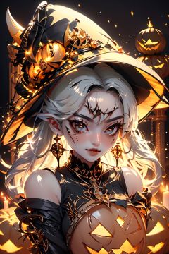 1girl,solo, photo realistic,super wide angle,evil look,eyes focus,earrings,jewelry,black hat,red eyes,face tattoo,jack-o'-lantern,pointy ears,looking at viewer,white long hair,witch hat,halloween,upper body,dress,pumpkin,white hair,black dress,breasts,black headwear,glowing,bangs,witch,thorns,castle,evening,candle,embers,black background,full moon,blood lips,medium breasts,fire,3D rendering,zichun, greendesign, 1