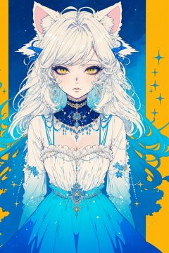 (((masterpiece, best quality))), ,1girl,long dress,,blue yellow theme,white hair,cat ears,