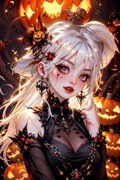 1girl,solo, photo realistic,super wide angle,evil look,eyes focus,earrings,jewelry,black hat,red eyes,face tattoo,jack-o'-lantern,pointy ears,looking at viewer,white long hair,witch hat,halloween,upper body,dress,pumpkin,white hair,black dress,breasts,black headwear,glowing,bangs,witch,thorns,castle,evening,candle,embers,black background,full moon,blood lips,medium breasts,fire,3D rendering,zichun
