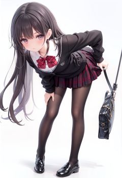 1girl, solo, pantyhose, skirt, long hair, loafers, shoes, simple background, school uniform, brown eyes, plaid, black pantyhose, plaid skirt, looking at viewer, black hair, pantyhose pull, full body, clothes pull, black footwear, pleated skirt, leaning forward, bangs, long sleeves, bent over, cardigan, bow, bowtie, standing, closed mouth, pulled by self, grey background, blush, miniskirt, red bow, sweater, **********