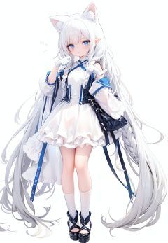 1girl, white_gloves, braid, full_body, gloves, long_hair, official_alternate_costume, pointy_ears, simple_background, solo, standing, very_long_hair, white_background, white hair, blue eyes, paw claw pose, open_mouth