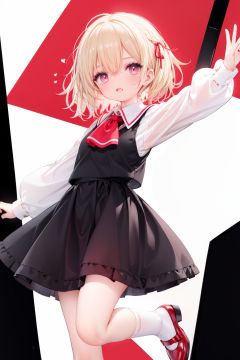 1girl, rumia, blonde hair, solo, white background, red eyes, red footwear, simple background, ascot, short hair, ribbon, open mouth, hair ribbon, smile, long sleeves, shirt, looking at viewer, red ascot, white socks, white shirt, red ribbon, shoes, socks, frills, bangs, outstretched arms, hair between eyes, skirt, :d, dress, vest, mary janes, black dress, black skirt, collared shirt, black vest, blush