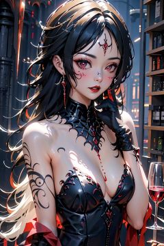 Vampire, 1 girl, cup, jewelry, earrings, solo, wine glass, red eyes, holding cup, wine glass, alcohol, black hair, red lips, chest, down, from the side, wine, parted lips, gloves, gemstones, upper body, makeup, best quality, high-resolution illustrations, stunning, high-level, complex details, best lighting,