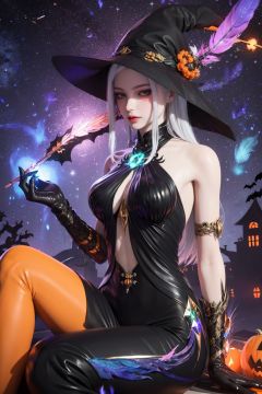 1girl,((lots of galaxy+halloween color feathers):1.3), orange tone color, cute face, sitting, Hair pumpkin, decorative art, pumpkin, xmv-hd, wsj-hd, xwhd, mds-hd,mdsc-hd, jyy-hd
