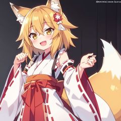 1girl, fox ears, solo,fox tail, open mouth, japanese clothes, hair ornament, smile, flower, blonde hair, miko, hair flower, looking at viewer, animal ear fluff, ribbon trim, hair between eyes, fox girl, short hair, brown eyes, ribbon-trimmed sleeves, wide sleeves, white background, long sleeves, outstretched arms, yellow eyes,   <lora:xian_1.0:1>