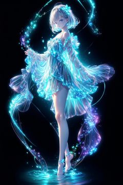 Best quality, 8k,cg,night,glowing,transparent,barefoot,1girl,standing_on_liquid,ripples,sparkler,dress,Formed by light,starry_background