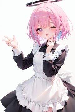 1girl, solo, apron, halo, hair over one eye, closed eyes, smile, white background, dress, white apron, simple background, long sleeves, multicolored hair, braid, open mouth, blue hair, alternate costume, blush, bangs, :d, pink hair, black dress, ribbon, frilled dress, enmaided, short hair, hand up, colored inner hair