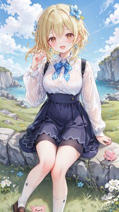 1girl, outdoors, dress, blonde hair, solo, sitting, day, socks, blue dress, looking at viewer, smile, open mouth, brown footwear, grass, earrings, sky, plaid, cloud, white socks, jewelry, plaid dress, shirt, bangs, blush, :d, blue sky, medium hair, shoes, rock, pig, brown eyes, animal, braid, white shirt, hand up, breasts, long hair, long sleeves