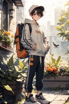 WANSHENG, pants, flower, hood, hoodie, 1boy, orange flower, shoes, hat, bag, male focus, holding, backpack, looking at viewer, gloves, drawstring, sneakers, solo, standing, plant, blue pants, long sleeves, yellow flower, white flower, brown hair, short hair, brown eyes, hand in pocket, closed mouth, full body, hair between eyes, white hoodie, hood down, food, smile, bird, black gloves, bottle, fingerless gloves, white headwear, bangs, english text, black footwear, handbook