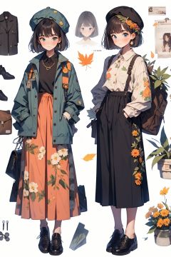 WANSHENG, hat, shirt, black footwear, short hair, brown hair, white shirt, beret, long sleeves, shoes, 2girls, full body, skirt, english text, multiple girls, neck ribbon, bangs, collared shirt, ribbon, shirt tucked in, standing, looking at viewer, bag, pants, coat, plaid, plant, floral print, blush, bob cut, pocket, shoulder bag, jacket, hand in pocket, blue eyes, red headwear, leaf, long skirt, earrings, leaf print, flower, orange headwear, plaid headwear, blue skirt, handbook
