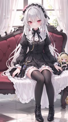 1girl, suigintou, solo, doll joints, red eyes, joints, long hair, dress, thighhighs, wings, hairband, lolita fashion, lolita hairband, sitting, frills, curtains, high heels, gothic lolita, black thighhighs, checkered floor, white hair, boots