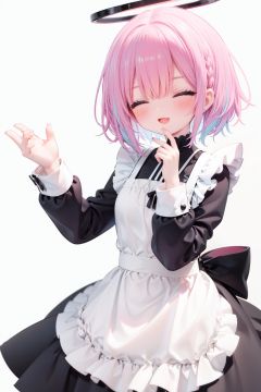 1girl, solo, apron, halo, hair over one eye, closed eyes, smile, white background, dress, white apron, simple background, long sleeves, multicolored hair, braid, open mouth, blue hair, alternate costume, blush, bangs, :d, pink hair, black dress, ribbon, frilled dress, enmaided, short hair, hand up, colored inner hair