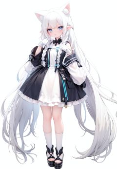 1girl, white_gloves, braid, full_body, gloves, long_hair, official_alternate_costume, pointy_ears, simple_background, solo, standing, very_long_hair, white_background, white hair, blue eyes, paw claw pose, open_mouth