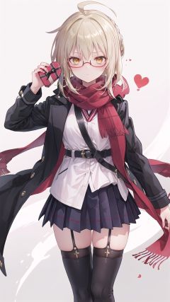 1girl, mysterious heroine x alter (first ascension) (fate), mysterious heroine x alter (fate), solo, artoria pendragon (fate), scarf, glasses, thighhighs, blonde hair, boots, sword, ahoge, red scarf, plaid scarf, weapon, looking at viewer, skirt, black thighhighs, knee boots, garter straps, yellow eyes, gift, semi-rimless eyewear, school uniform, valentine, plaid, under-rim eyewear, belt boots, full body, braid, black-framed eyewear, jacket, pleated skirt, holding, box, excalibur (fate/stay night), coat, french braid