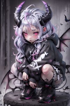 kawj,chibi, horns, tail, wings, bug, butterfly, demon tail, 1boy, male focus, pink eyes, white hair, demon wings, otoko no ko, hoodie, solo, demon horns, hood, demon boy, looking at viewer, black hoodie, demon girl, squatting, white butterfly, demon, bat wings, jacket,  best quality,masterpiece,realistic,HDR,UHD,8K,