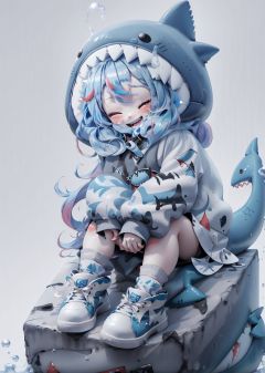kawj,chibi, 1girl, virtual youtuber, teeth, gawr gura, hood, blue eyes, sharp teeth, one eye closed, shark hood, multicolored hair, blue hair, grey hair, animal hood, solo, sleeves past wrists, streaked hair, shark tail, fish tail, smile, sitting, blue hoodie, hoodie, tail, open mouth, shoes, blush, shark girl, sleeves past fingers, long sleeves, sneakers, bangs, ;d, white footwear, hood up, stuffed toy, socks, looking at viewer,  best quality,masterpiece,realistic,HDR,UHD,8K,