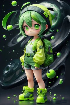 kawj,chibi,1girl, solo, green eyes, bag, backpack, long sleeves, boots, green background, full body, green footwear, green headwear, hat, standing, shirt, gradient background, ahoge, gradient, belt, looking at viewer, green hair, green theme, holding, shorts,  universe,   <lora:kawj_V1:0.8>