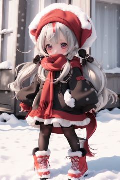 kawj,chibi,1girl, solo, long hair, full body, hat, boots, bangs, dress, long sleeves, white hair, twintails, red eyes, very long hair, standing, holding, pantyhose, scarf, wide sleeves, hair between eyes, sleeves past wrists, looking at viewer, red scarf, blush, low twintails, black pantyhose, artist name, red footwear, snow, red headwear,      <lora:kawj_V1:0.9>
