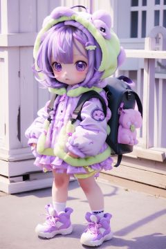 kawj,chibi,1girl, solo, backpack, blush, looking at viewer, shoes, bag, purple hair, full body, long hair, hair ornament, dress, hood, pink eyes, twintails, white footwear, standing,    <lora:kawj_V1:0.9>