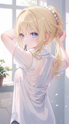 1girl, solo, blonde hair, shirt, long hair, short sleeves, blue eyes, white shirt, ponytail, upper body, looking at viewer, tying hair, from behind, arms up, nape, breasts, bangs, looking back, sidelocks, mouth hold, hair tie