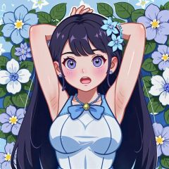 blue flower, flower, hydrangea, white flower, bracelet, 1girl, lily \(flower\), daisy, bell, blue rose, long hair, purple flower, solo, jewelry, breasts, dress, blue theme, arms up, open mouth, armpits, looking at viewer, medium breasts