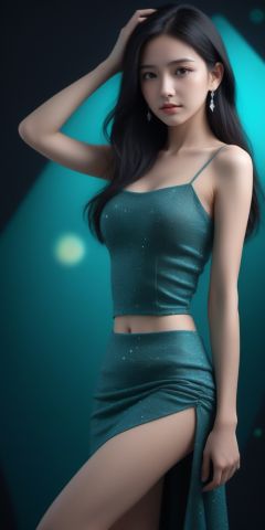 masterpiece,best quality,official art,extremely detailed CG unity 8k wallpaper,small breasts,1girl, Long black hair,whole body,exposure blend,medium shot,bokeh,(hdr:1.4),high contrast,(cinematic, teal :0.85),(muted colors, dim colors, soothing tones:1.3),natural external halo, excellent color and light effects, (color deviation, color deviation, color reproduction: 1.1) ,((black background)). diamond earrings.waist,skirt,leg.