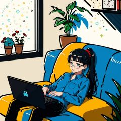 <lora:chahua_20230605230944:1>,best quality,masterpiece,Flat,1girl,black cat,black hair,ponytail,cat,black pants,glasses,jewelry,flower,couch,pants,earrings,clock,plant,book,solo,long sleeves,shirt,lying,blue shirt,red flower,potted plant,indoors,laptop,aqua shirt,holding,shadow,<lora:Flat_20231016103615-08:0.8>,