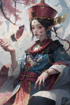 (masterpiece, top quality),high quality),red eyes, solo, black hair, pointy ears, hat, jewelry, earrings, pale skin, flower, male focus, 1boy, ofuda, jiangshi, qing guanmao, necklace, beads, colored skin, horror (theme)