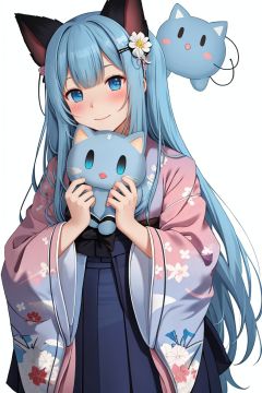 floral print, japanese clothes, kimono, 1girl, print kimono, animal ears, long hair, wide sleeves, blue hair, smile, white background, hair ornament, holding, closed mouth, long sleeves, stuffed toy, hakama, blush, blue eyes, simple background, animal, hakama skirt, bangs, skirt, eyebrows visible through hair, solo, stuffed animal, stuffed cat, looking at viewer