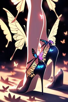 shuijingxie, high heels, solo, 1girl, blurry, shadow, legs, wings, strappy heels, light particles, butterfly wings, blurry background, depth of field, stiletto heels, lower body, gem