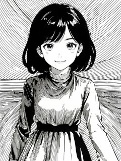 (((best quality,masterpiece,fine detailed,))),<lora:CJ BWD:0.8>,line,black and white painting,black and white line drawing,smooth lines,monochrome,a girl,kind_smile,smile,front,whole body,wearing a skirt,dynamic,, (best quality, high quality, masterpiece,),