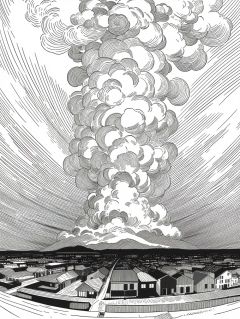 (((best quality,masterpiece,fine detailed,))),<lora:CJ BWD:0.8>,line,black and white painting,black and white line drawing,smooth lines,monochrome,city background,tall building,top view,close-up,clear details,explosion,mushroom cloud,sky,white clouds,the escape man,car,street,, (best quality, high quality, masterpiece,),