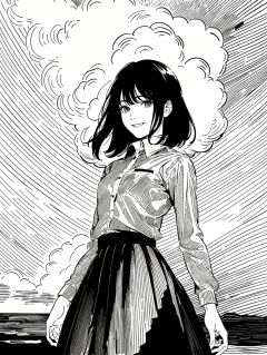 (((best quality,masterpiece,fine detailed,))),<lora:CJ BWD:0.8>,line,black and white painting,black and white line drawing,smooth lines,monochrome,a girl,kind_smile,smile,front,whole body,wearing a skirt,dynamic,sky background,there are clouds in the sky,white clouds,, (best quality, high quality, masterpiece,),
