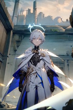 [1girl:1boy:0.4],hollow eyes,halo,scenery,pale white tone,expressionless,asymmetrical clothes,light trail,indoors,ruins,<lora:starrail-blbg:1>