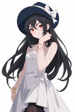(cowboy_shot:1.2),absurdres,(1 girl),(solo),(shiny skin:1.1),illustration,disheveled hair,(beautiful detailed face),(beautiful detailed hair),(beautiful detailed eyes),whole body,right human structure,black hair,long hair,red eyes,(black legwear:1.2),(white_background:1.3),(vampire:1.3),hat bow,smile,(evening_gown:1.2),(tsurime:1.4),(bracelet:1.3),