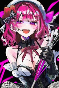 by ziyun, best quality, masterpiece, pseudo impasto, 1girl, solo, holding, fishnets, pink hair, fishnet pantyhose, gloves, hair ornament, pantyhose, pink eyes, smile, medium hair, black gloves, open mouth, bangs, black background, detached sleeves, hat, hairclip