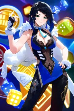 by modare, yelan \(genshin impact\), 1girl, breasts, solo, jewelry, blue hair, gloves, bangs, looking at viewer, fur trim, short hair, mole on breast, earrings, jacket on shoulders, large breasts, cleavage, hand on hip, white jacket, jacket, bracelet, mole, dice, fur-trimmed jacket, smile, green eyes, flower, blue dress, dress, black hair, multicolored hair, blue eyes, vision \(genshin impact\), fingerless gloves, white gloves, tassel, closed mouth, asymmetrical gloves, bob cut, pants, pelvic curtain, tight pants, mismatched gloves, sleeveless, diagonal bangs