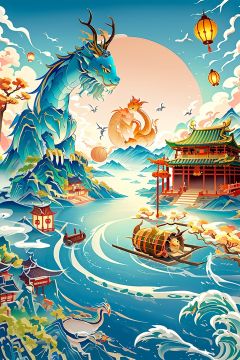 masterpiece,best quality,guochao\(style\), mountain, water, eastern dragon, flower, bird, east asian architecture, cloud, dragon, architecture, sun, boat, horns, fish, watercraft, no humans, animal, outdoors, waves, sky, scenery, holding, tree, lantern, tail, ocean <lora:guochao-000006:0.7>,