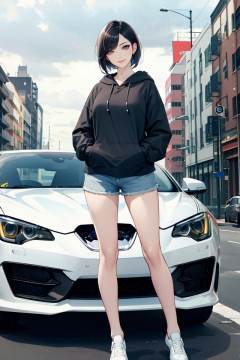 (masterpiece),(best quality),highres,incredibly absurdres,absurdres,very_high resolution,original,intricate details,hyper detail,ultra-detailed,exquisite detailed,extremely delicate,illustration,(1girl),(solo),solo_focus,looking at viewer,mature female,shiny hair,glossy hair,forehead,diagonal bangs,swept bangs,short hair,hair behind ear,black hair,sharp_eyelid,eyeliner,eyelashes,eyeshadow,lipgloss,lips,high_nose,smile,seductive smile,glossy skin,pale skin,shiny skin,medium_breasts,perky_breasts,standing, fullbody,yellow car, cloudy sky,city,motor vehicle,ground vehicle,sports car,vehicle focus, white footwear,denim shorts, gray hoodie,bare legs, hands in pockets,