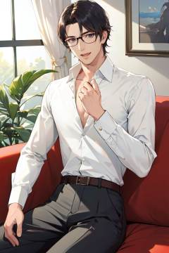 (masterpiece),(best quality),(highres),(incredibly absurdres),(absurdres),very_high_resolution,intricate details,hyper detail,ultra-detailed,exquisite detailed,extremely delicate,illustration,pixiv,chromatic aberration,emphasis lines,game cg,film grain,cinematic,bokeh,caustics,(1boy),(solo),solo_focus,shiny hair,glossy hair,mature male,muscular male,handsome boy,man,male focus,(perfect detailed face),hands,fingers,(cowboy shot), short hair, black hair,forehead,parted bangs,narrow waist,strong,smile, open mouth, glasses,collarbone, formal, pants, suit, white shirt,collared shirt, partially unbuttoned, long sleeves,sitting, sitting,office_man,sofa,indoors,plant,living room,reflective floor,