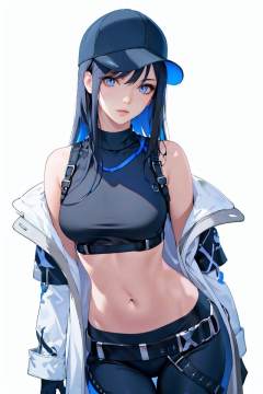(masterpiece),(best quality),highres,incredibly absurdres,absurdres,very_high resolution,original,intricate details,hyper detail,ultra-detailed,exquisite detailed,extremely delicate,illustration,pixiv,chromatic aberration,emphasis lines,game cg,film grain,cinematic,bokeh,caustics,(1girl),(solo),mature female,(perfect detailed face),lips,(lipgloss),glossy skin,(shiny skin),feminine proportions,skinny,narrow waist,slim,wide hips,curvy, medium_breasts,perky_breasts,cowboy shot,(white background:1.3), <lora:碧蓝档案沙织brj-saori-V1:1> saori \(blue archive\), long hair, black hair, blue hair, multicolored hair, blue eyes, baseball cap, open clothes, off shoulder, coat, crop top, chest harness, snap-fit buckle, black pants, thigh holster, gloves,harness, thigh holster, snap-fit buckle,