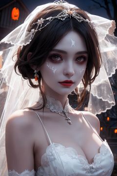 Halloween Makeup , Halloween carnival night, Ghost bridal makeup, Crisp white wedding dress, Perfect for battle damage, True photography style, Bat and ghost fire, Pumpkin background, Epic picture, Face the camera, Whole body, Close-up, Realism, Super detail, 16K, HD, xinniang, yan