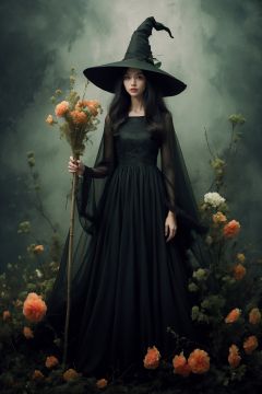 <lora:wlqc_20231023163432:1>1girl, hat, solo, dress, witch hat, staff, witch, holding, long hair, flower, standing, black dress, plant, green dress, holding staff, lips