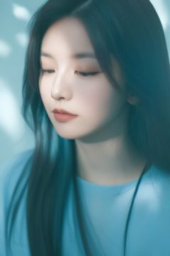cinematic film still 1girl,closed eyes,light blue,Straight hair,long hair,light cream,upper body,light simple background,looking at viewer,bluntbangs,, . shallow depth of field, vignette, highly detailed, high budget, bokeh, cinemascope, moody, epic, gorgeous, film grain, grainy, realistic